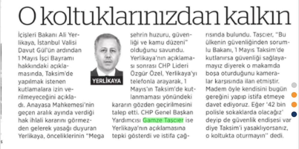 AK Parti Etimesgut İlçe Başkanlığı Arefe Mesajı Yayınladıİçişleri Bakanı'nın 1 Mayıs kutlamaları ile ilgili yapmış olduğu açıklamalar tartışma yaratmıştır. Bakan, eğer 1 Mayıs kutlamaları Taksim Meydanı'nda yapılırsa, güvenlik sağlanamayacağını belirtti. Bu açıklama, güvenlikten sorumlu bir bakanın bu tür bir etkinlik için yeterli güvenlik önlemi alamayacağını ifade etmesi nedeniyle eleştirilere neden olmuştur. Bu durum, bakanın görevini yerine getirememekle suçlanmasına yol açmıştır, ve bu tür açıklamalar kamuoyunda ciddi tartışmaların yaşanmasına sebep olmuştur.